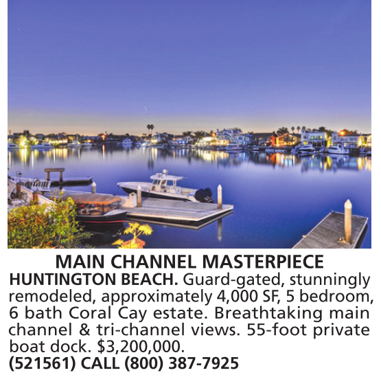 cabinets, MAIN CHANNEL MASTERPIECE HUNTINGTON BEACH. Guard-gated, stunningly remodeled, approximately 4,000 SF, 5 bedroom, 6 bath Coral Cay estate. Breathtaking main channel & tri-channel views. 55-foot private boat dock. $3,200,000. (521561) CALL (800) 387-7925