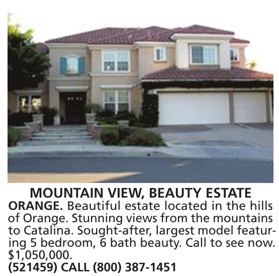 suites, MOUNTAIN VIEW, BEAUTY ESTATE ORANGE. Beautiful estate located in the hills of Orange. Stunning views from the mountains to Catalina. Sought-after, largest model featuring 5 bedroom, 6 bath beauty. Call to see now. $1,050,000. (521459) CALL (800) 387-1451