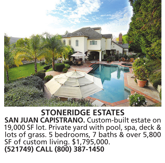 STONERIDGE ESTATES SAN JUAN CAPISTRANO. Custom-built estate on 19,000 SF lot. Private yard with pool, spa, deck & lots of grass. 5 bedrooms, 7 baths & over 5,800 SF of custom living. $1,795,000. (521749) CALL (800) 387-1450