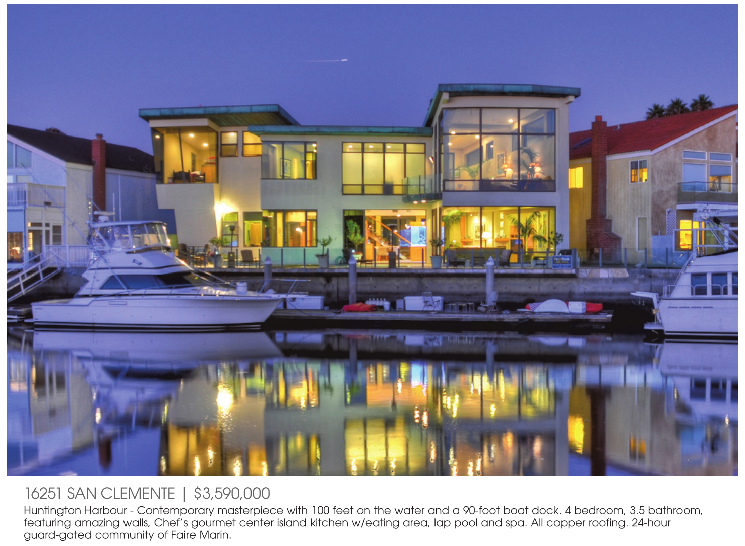 16251 SAN CLEMENTE | $3,590,000 Huntington Harbour - Contemporary masterpiece with 100 feet on the water and a 90-foot boat dock. 4 bedroom, 3.5 bathroom, featuring amazing walls, Chef’s gourmet center island kitchen w/eating area, lap pool and spa. All copper roofing. 24-hour guard-gated community of Faire Marin.