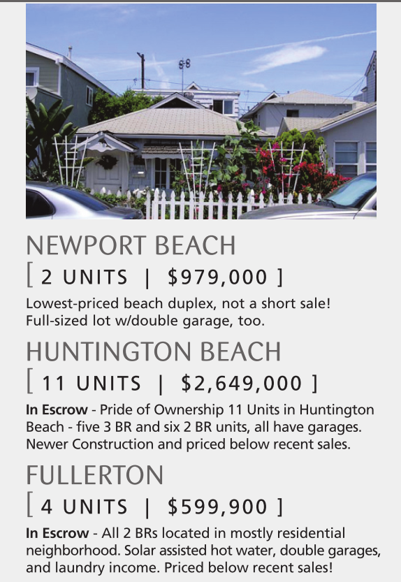 NEWPORT BEACH [ 2 UNITS | $979,000 ] Lowest-priced beach duplex, not a short sale! Full-sized lot w/double garage, too. HUNTINGTON BEACH [ 11 UNITS | $2,649,000 ] In Escrow - Pride of Ownership 11 Units in Huntington Beach - five 3 BR and six 2 BR units, all have garages. Newer Construction and priced below recent sales. FULLERTON [ 4 UNITS | $599,900 ] In Escrow - All 2 BRs located in mostly residential neighborhood. Solar assisted hot water, double garages, and laundry income. Priced below recent sales!