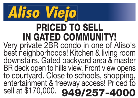 Aliso Viejo PRICED TO SELL IN GATED COMMUNITY! Very private 2BR condo in one of Aliso's best neighborhoods! Kitchen & living room downstairs. Gated backyard area & master BR deck open to hills view. Front view opens to courtyard. Close to schools, shopping, entertainment & freeway access! Priced to sell at $170,000. 949/257-4000