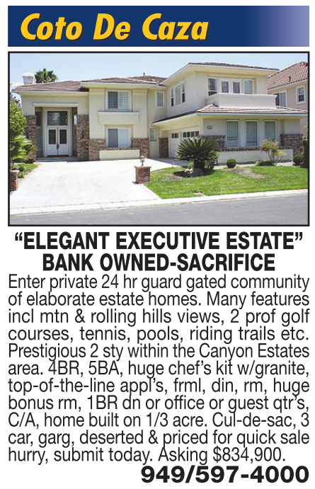 “ELEGANT EXECUTIVE ESTATE” BANK OWNED-SACRIFICE Enter private 24 hr guard gated community of elaborate estate homes. Many features incl mtn & rolling hills views, 2 prof golf courses, tennis, pools, riding trails etc. Prestigious 2 sty within the Canyon Estates area. 4BR, 5BA, huge chef’s kit w/granite, top-of-the-line appl’s, frml, din, rm, huge bonus rm, 1BR dn or office or guest qtr’s, C/A, home built on 1/3 acre. Cul-de-sac, 3 car, garg, deserted & priced for quick sale hurry, submit today. Asking $834,900.