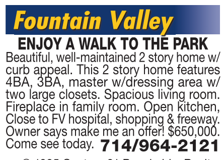 Fountain Valley ENJOY A WALK TO THE PARK Beautiful, well-maintained 2 story home w/ curb appeal. This 2 story home features 4BA, 3BA, master w/dressing area w/ two large closets. Spacious living room. Fireplace in family room. Open kitchen, Close to FV hospital, shopping & freeway. Owner says make me an offer! $650,000. Come see today. 714/964-2121 © 1995 Century 21 Beachside, Realtors.