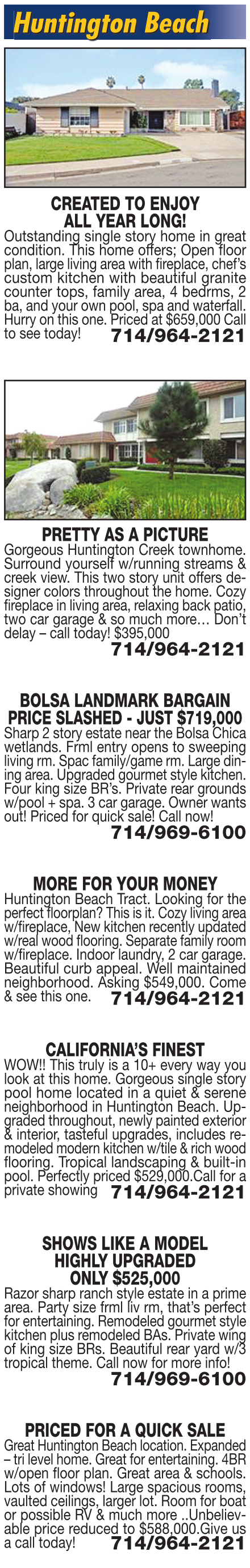 PRETTY AS A PICTURE Gorgeous Huntington Creek townhome. Surround yourself w/running streams & creek view. This two story unit offers designer colors throughout the home. Cozy fireplace in living area, relaxing back patio, two car garage & so much more… Don’t delay – call today! $395,000 714/964-2121