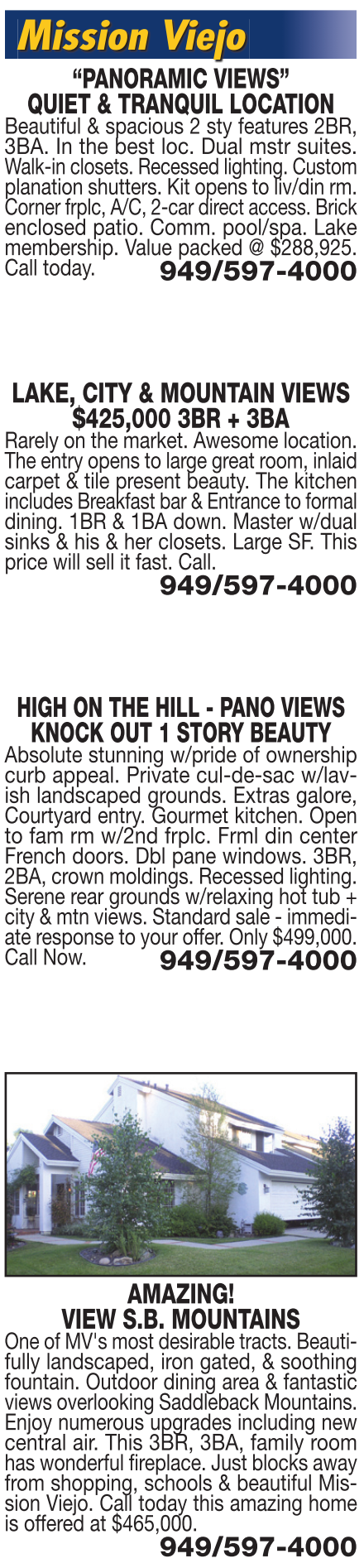 Mission Viejo “PANORAMIC VIEWS” QUIET & TRANQUIL LOCATION Beautiful & spacious 2 sty features 2BR, 3BA. In the best loc. Dual mstr suites. Walk-in closets. Recessed lighting. Custom planation shutters. Kit opens to liv/din rm. Corner frplc, A/C, 2-car direct access. Brick enclosed patio. Comm. pool/spa. Lake membership. Value packed @ $288,925. Call today. 949/597-4000 LAKE, CITY & MOUNTAIN VIEWS $425,000 3BR + 3BA Rarely on the market. Awesome location. The entry opens to large great room, inlaid carpet & tile present beauty. The kitchen includes Breakfast bar & Entrance to formal dining. 1BR & 1BA down. Master w/dual sinks & his & her closets. Large SF. This price will sell it fast. Call. 949/597-4000 HIGH ON THE HILL - PANO VIEWS KNOCK OUT 1 STORY BEAUTY Absolute stunning w/pride of ownership curb appeal. Private cul-de-sac w/lavish landscaped grounds. Extras galore, Courtyard entry. Gourmet kitchen. Open to fam rm w/2nd frplc. Frml din center French doors. Dbl pane windows. 3BR, 2BA, crown moldings. Recessed lighting. Serene rear grounds w/relaxing hot tub + city & mtn views. Standard sale - immediate response to your offer. Only $499,000. Call Now. 949/597-4000 AMAZING! VIEW S.B. MOUNTAINS One of MV's most desirable tracts. Beautifully landscaped, iron gated, & soothing fountain. Outdoor dining area & fantastic views overlooking Saddleback Mountains. Enjoy numerous upgrades including new central air. This 3BR, 3BA, family room has wonderful fireplace. Just blocks away from shopping, schools & beautiful Mission Viejo. Call today this amazing home is offered at $465,000. 949/597-4000