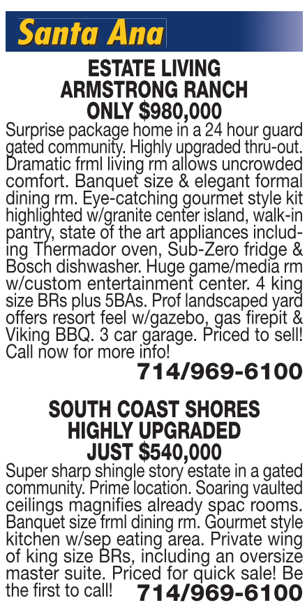 Santa Ana ESTATE LIVING ARMSTRONG RANCH ONLY $980,000 Surprise package home in a 24 hour guard gated community. Highly upgraded thru-out. Dramatic frml living rm allows uncrowded comfort. Banquet size & elegant formal dining rm. Eye-catching gourmet style kit highlighted w/granite center island, walk-in pantry, state of the art appliances including Thermador oven, Sub-Zero fridge & Bosch dishwasher. Huge game/media rm w/custom entertainment center. 4 king size BRs plus 5BAs. Prof landscaped yard offers resort feel w/gazebo, gas firepit & Viking BBQ. 3 car garage. Priced to sell! Call now for more info! 714/969-6100 SOUTH COAST SHORES HIGHLY UPGRADED JUST $540,000 Super sharp shingle story estate in a gated community. Prime location. Soaring vaulted ceilings magnifies already spac rooms. Banquet size frml dining rm. Gourmet style kitchen w/sep eating area. Private wing of king size BRs, including an oversize master suite. Priced for quick sale! Be the first to call! 714/969-6100