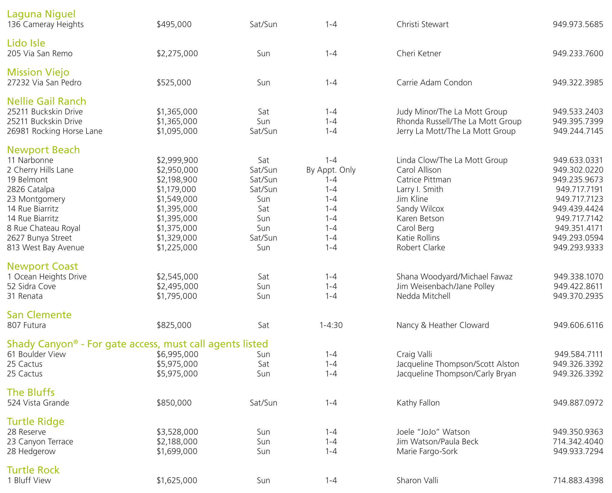 Laguna Niguel 136 Cameray Heights $495,000 Sat/Sun 1-4 Christi Stewart 949.973.5685 Lido Isle 205 Via San Remo $2,275,000 Sun 1-4 Cheri Ketner 949.233.7600 Mission Viejo 27232 Via San Pedro $525,000 Sun 1-4 Carrie Adam Condon 949.322.3985 Nellie Gail Ranch 25211 Buckskin Drive $1,365,000 Sat 1-4 Judy Minor/The La Mott Group 949.533.2403 25211 Buckskin Drive $1,365,000 Sun 1-4 Rhonda Russell/The La Mott Group 949.395.7399 26981 Rocking Horse Lane $1,095,000 Sat/Sun 1-4 Jerry La Mott/The La Mott Group 949.244.7145 Newport Beach 11 Narbonne $2,999,900 Sat 1-4 Linda Clow/The La Mott Group 949.633.0331 2 Cherry Hills Lane $2,950,000 Sat/Sun By Appt. Only Carol Allison 949.302.0220 19 Belmont $2,198,900 Sat/Sun 1-4 Catrice Pittman 949.235.9673 2826 Catalpa $1,179,000 Sat/Sun 1-4 Larry I. Smith 949.717.7191 23 Montgomery $1,549,000 Sun 1-4 Jim Kline 949.717.7123 14 Rue Biarritz $1,395,000 Sat 1-4 Sandy Wilcox 949.439.4424 14 Rue Biarritz $1,395,000 Sun 1-4 Karen Betson 949.717.7142 8 Rue Chateau Royal $1,375,000 Sun 1-4 Carol Berg 949.351.4171 2627 Bunya Street $1,329,000 Sat/Sun 1-4 Katie Rollins 949.293.0594 813 West Bay Avenue $1,225,000 Sun 1-4 Robert Clarke 949.293.9333 Newport Coast 1 Ocean Heights Drive $2,545,000 Sat 1-4 Shana Woodyard/Michael Fawaz 949.338.1070 52 Sidra Cove $2,495,000 Sun 1-4 Jim Weisenbach/Jane Polley 949.422.8611 31 Renata $1,795,000 Sun 1-4 Nedda Mitchell 949.370.2935 San Clemente 807 Futura $825,000 Sat 1-4:30 Nancy & Heather Cloward 949.606.6116 Shady Canyon ® - For gate access, must call agents listed 61 Boulder View $6,995,000 Sun 1-4 Craig Valli 949.584.7111 25 Cactus $5,975,000 Sat 1-4 Jacqueline Thompson/Scott Alston 949.326.3392 25 Cactus $5,975,000 Sun 1-4 Jacqueline Thompson/Carly Bryan 949.326.3392 The Bluffs 524 Vista Grande $850,000 Sat/Sun 1-4 Kathy Fallon 949.887.0972 Turtle Ridge 28 Reserve $3,528,000 Sun 1-4 Joele “JoJo” Watson 949.350.9363 23 Canyon Terrace $2,188,000 Sun 1-4 Jim Watson/Paula Beck 714.342.4040 28 Hedgerow $1,699,000 Sun 1-4 Marie Fargo-Sork 949.933.7294 Turtle Rock 1 Bluff View $1,625,000 Sun 1-4 Sharon Valli 714.883.4398
