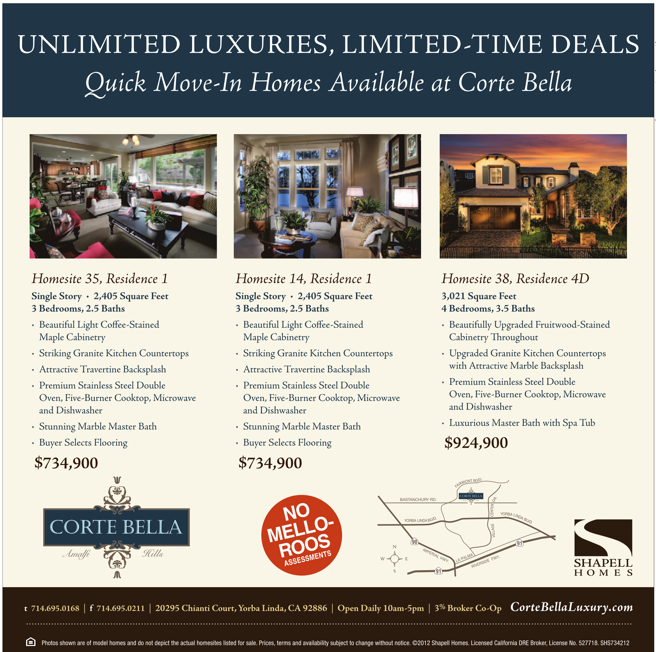 Photos shown are of model homes and do not depict the actual homesites listed for sale. Prices, terms and availability subject to change without notice. ©2012 Shapell Homes. Licensed California DRE Broker, License No. 527718. SHS734212
