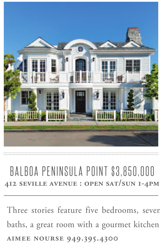 Three stories feature five bedrooms, seven baths, a great room with a gourmet kitchen. aimee nourse 949.395.4300