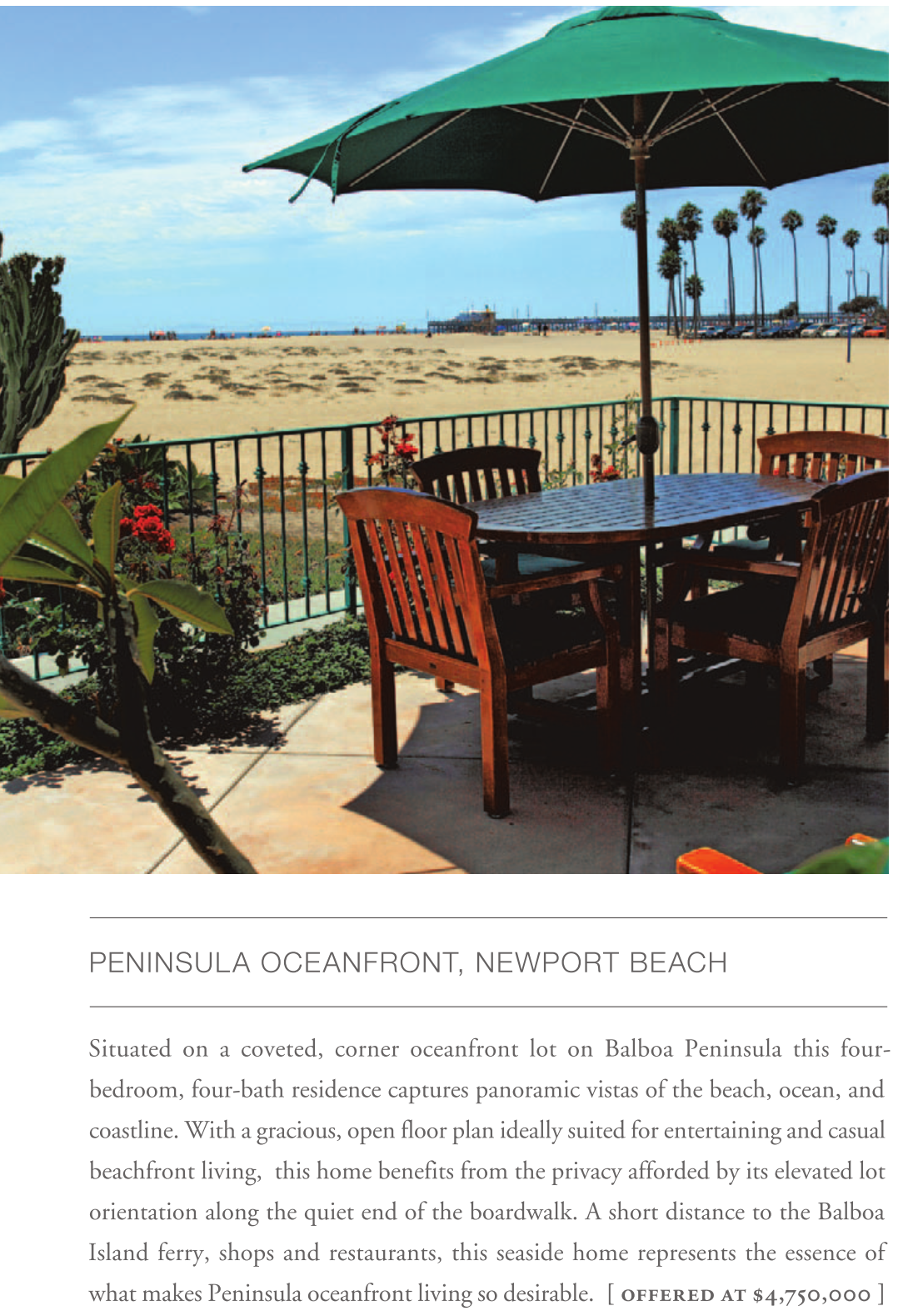 PENINSULA OCEANFRONT, NEWPORT BEACH Situated on a coveted, corner oceanfront lot on Balboa Peninsula this fourbedroom, four-bath residence captures panoramic vistas of the beach, ocean, and coastline. With a gracious, open floor plan ideally suited for entertaining and casual beachfront living, this home benefits from the privacy afforded by its elevated lot orientation along the quiet end of the boardwalk. A short distance to the Balboa Island ferry, shops and restaurants, this seaside home represents the essence of what makes Peninsula oceanfront living so desirable. [ offered at $4,750,000 ]