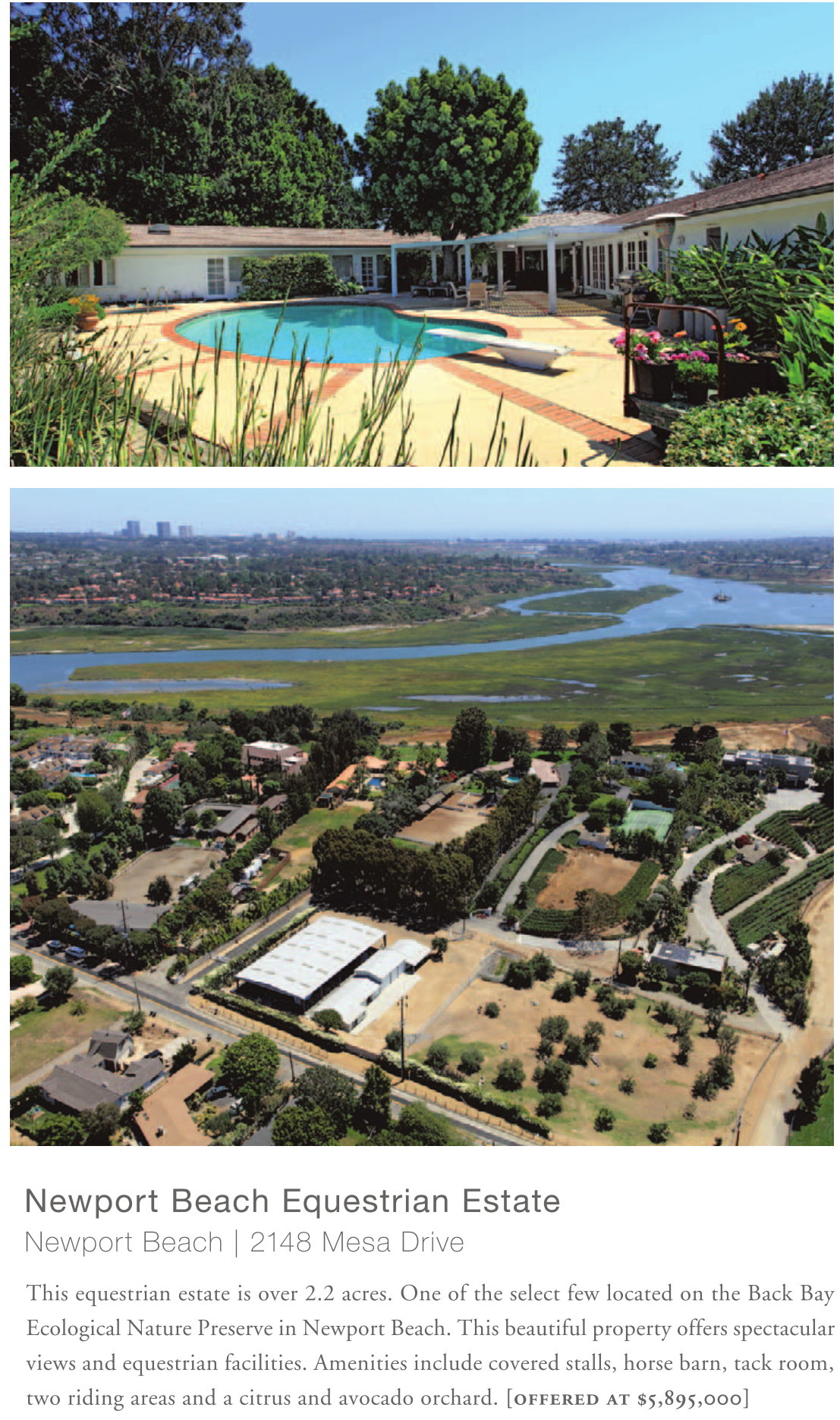 Newport Beach Equestrian Estate Newport Beach | 2148 Mesa Drive This equestrian estate is over 2.2 acres. One of the select few located on the Back Bay Ecological Nature Preserve in Newport Beach. This beautiful property offers spectacular views and equestrian facilities. Amenities include covered stalls, horse barn, tack room, two riding areas and a citrus and avocado orchard. [offered at $5,895,000]