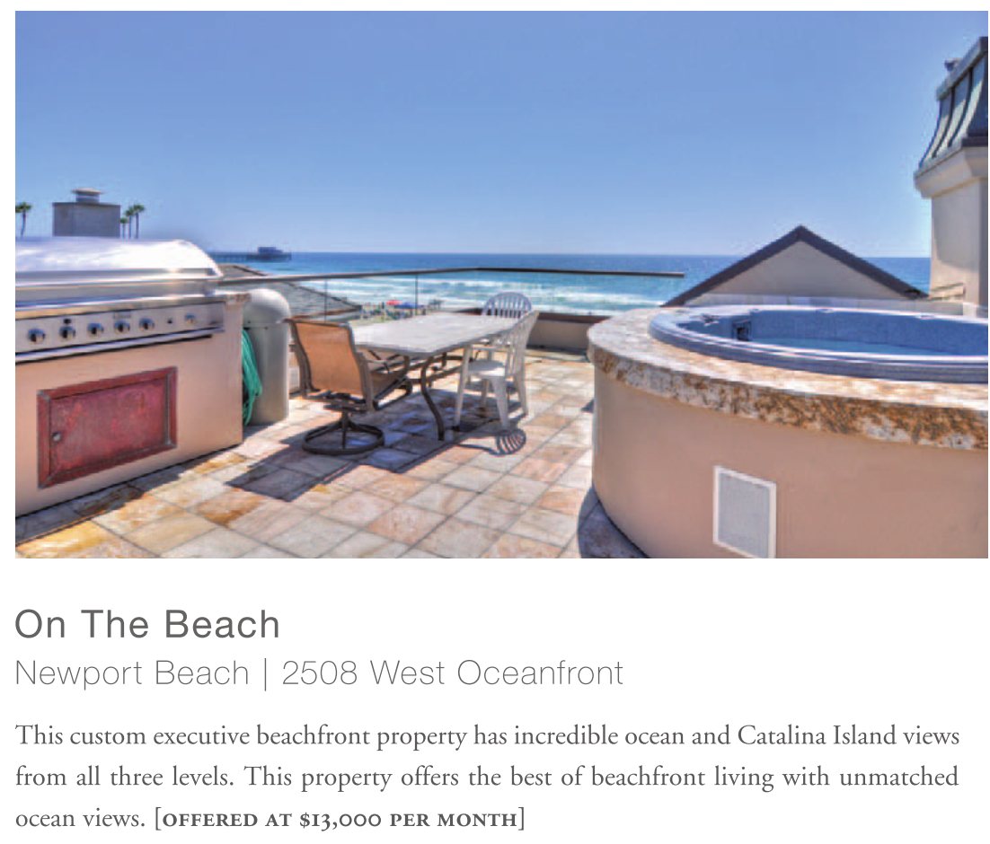 On The Beach Newport Beach | 2508 West Oceanfront This custom executive beachfront property has incredible ocean and Catalina Island views from all three levels. This property offers the best of beachfront living with unmatched ocean views. [offered at $13,000 per month]