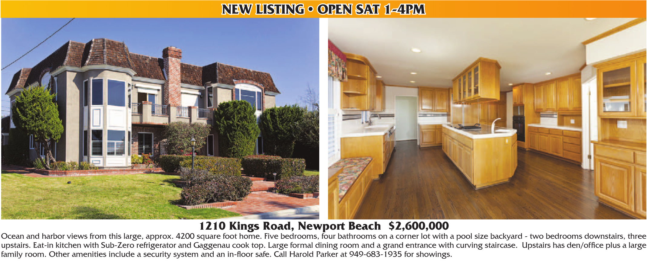 upstairs. Eat-in kitchen with Sub-Zero refrigerator and Gaggenau cook top. Large formal dining room and a grand entrance with curving staircase. Upstairs has den/office plus a large family room. Other amenities include a security system and an in-floor safe. Call Harold Parker at 949-683-1935 for showings.