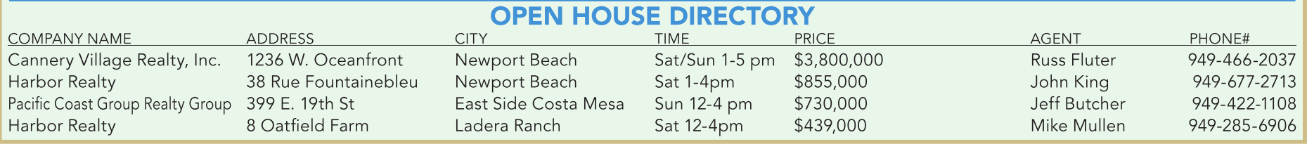OPEN HOUSE DIRECTORY COMPANY NAME ADDRESS CITY TIME PRICE AGENT PHONE# Cannery Village Realty, Inc. 1236 W. Oceanfront Newport Beach Sat/Sun 1-5 pm $3,800,000 Russ Fluter 949-466-2037 Harbor Realty 38 Rue Fountainebleu Newport Beach Sat 1-4pm $855,000 John King 949-677-2713 Pacific Coast Group Realty Group 399 E. 19th St East Side Costa Mesa Sun 12-4 pm $730,000 Jeff Butcher 949-422-1108 Harbor Realty 8 Oatfield Farm Ladera Ranch Sat 12-4pm $439,000 Mike Mullen 949-285-6906