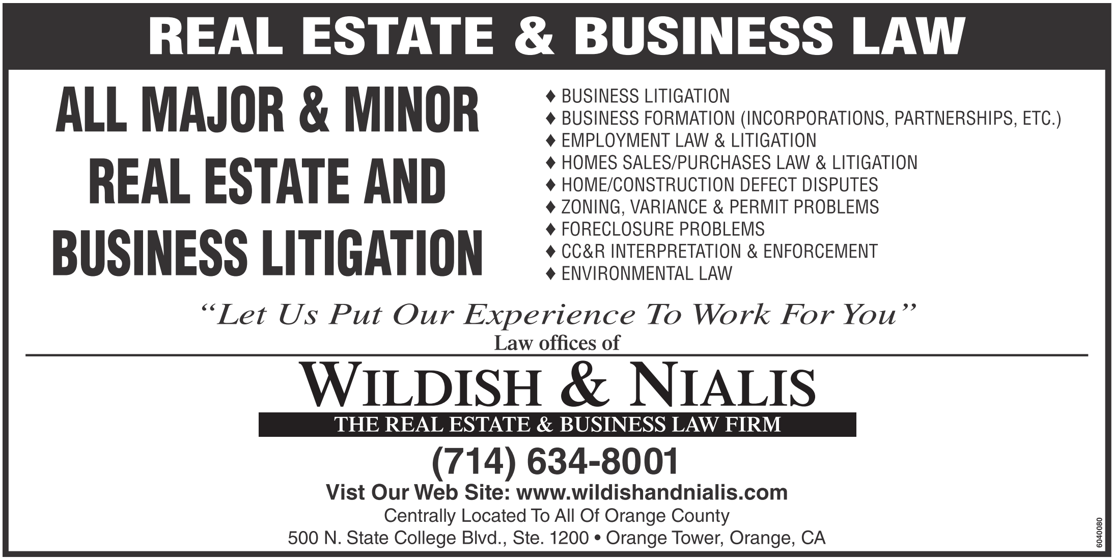 EMPLOYMENT LAW & LITIGATION HOMES SALES/PURCHASES LAW & LITIGATION HOME/CONSTRUCTION DEFECT DISPUTES ZONING, VARIANCE & PERMIT PROBLEMS FORECLOSURE PROBLEMS CC&R INTERPRETATION & ENFORCEMENT ENVIRONMENTAL LAW