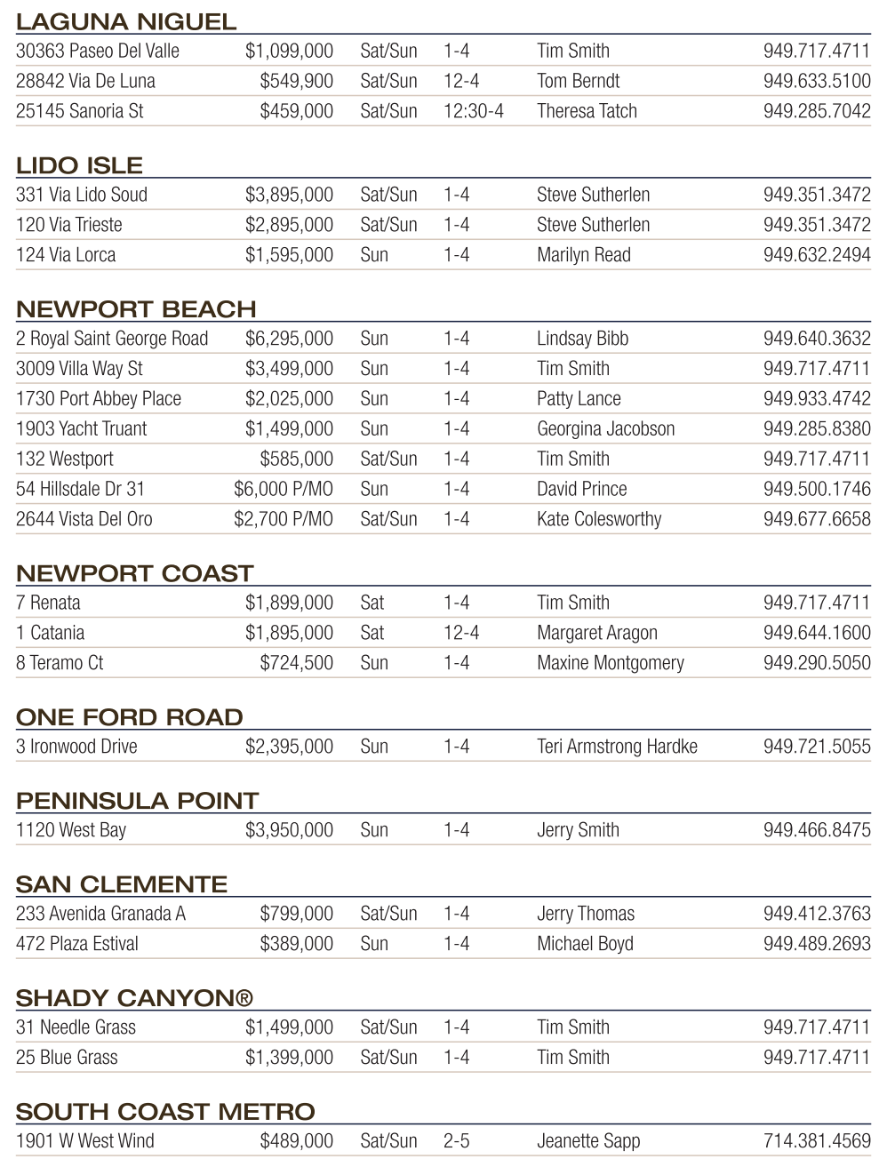 NEWPORT COAST 7 Renata $1,899,000 Sat 1-4 Tim Smith 949.717.4711 1 Catania $1,895,000 Sat 12-4 Margaret Aragon 949.644.1600 8 Teramo Ct $724,500 Sun 1-4 Maxine Montgomery 949.290.5050