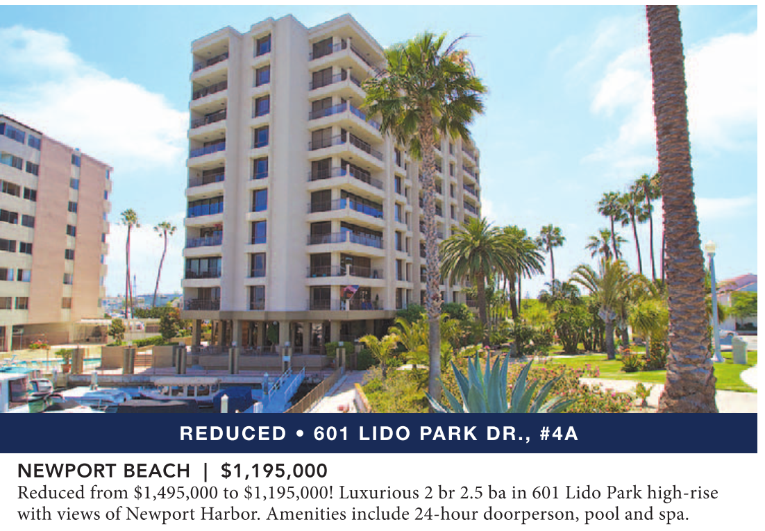 NEWPORT BEACH | $1,195,000 Reduced from $1,495,000 to $1,195,000! Luxurious 2 br 2.5 ba in 601 Lido Park high-rise with views of Newport Harbor. Amenities include 24-hour doorperson, pool and spa.