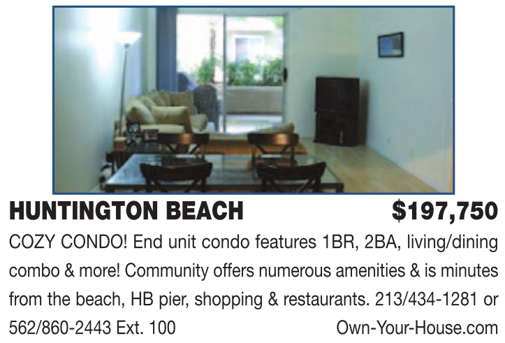 COZY CONDO! End unit condo features 1BR, 2BA, living/dining combo & more! Community offers numerous amenities & is minutes from the beach, HB pier, shopping & restaurants. 213/434-1281 or 562/860-2443 Ext. 100 Own-Your-House.com
