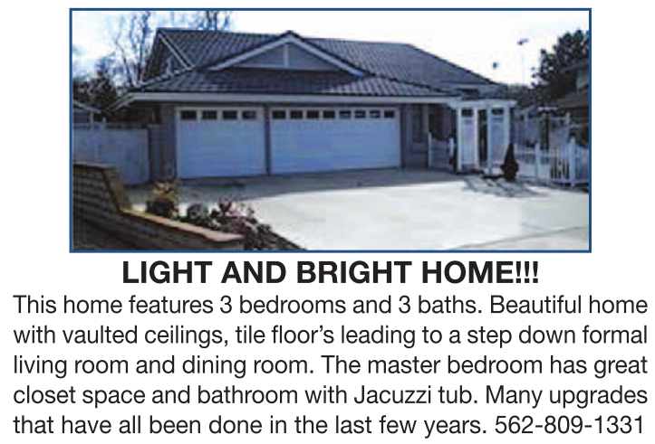 This home features 3 bedrooms and 3 baths. Beautiful home with vaulted ceilings, tile floor’s leading to a step down formal living room and dining room. The master bedroom has great closet space and bathroom with Jacuzzi tub. Many upgrades that have all been done in the last few years. 562-809-1331