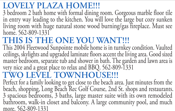 LOVELY PLAZA HOME!!! 3 bedroom 2 bath home with formal dining room. Gorgeous marble floor tile in entry way leading to the kitchen. You will love the large but cozy sunken living room with huge natural stone wood burning/gas fireplace. Must see home. 562-809-1331 THIS IS THE ONE YOU WANT!!!