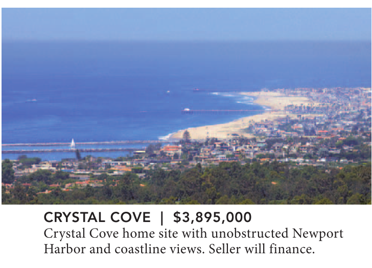 CRYSTAL COVE | $3,895,000 Crystal Cove home site with unobstructed Newport Harbor and coastline views. Seller will finance.