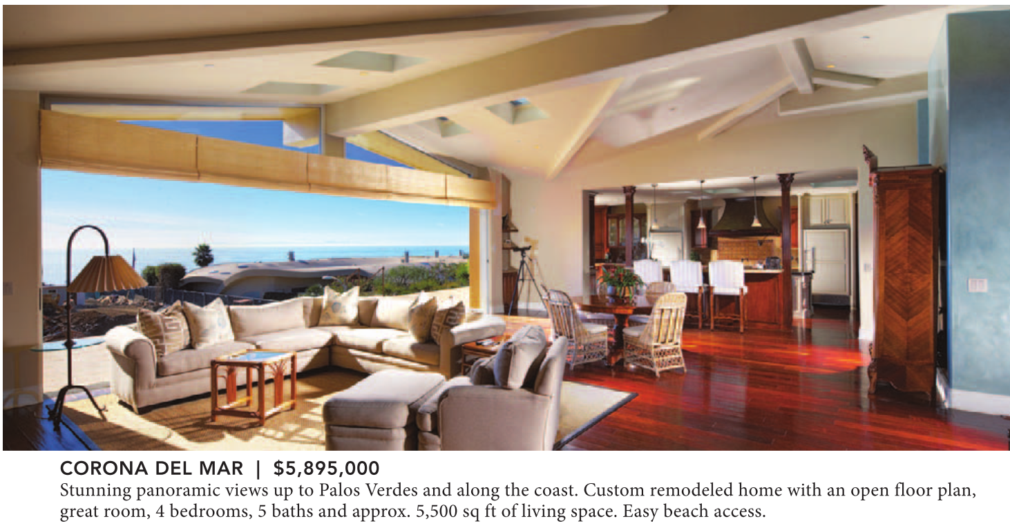 CORONA DEL MAR | $5,895,000 Stunning panoramic views up to Palos Verdes and along the coast. Custom remodeled home with an open floor plan, great room, 4 bedrooms, 5 baths and approx. 5,500 sq ft of living space. Easy beach access.