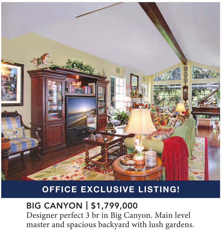 BIG CANYON $1,799,000 Designer perfect 3 br in Big Canyon. Main level master and spacious backyard with lush gardens.