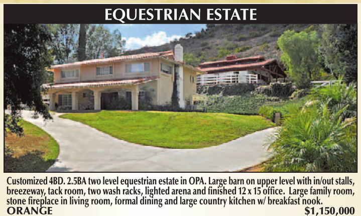 Customized 4BD. 2.5BA two level equestrian estate in OPA. Large barn on upper level with in/out stalls, breezeway, tack room, two wash racks, lighted arena and finished 12 x 15 office. Large family room, stone fireplace in living room, formal dining and large country kitchen w/ breakfast nook. ORANGE $1,150,000