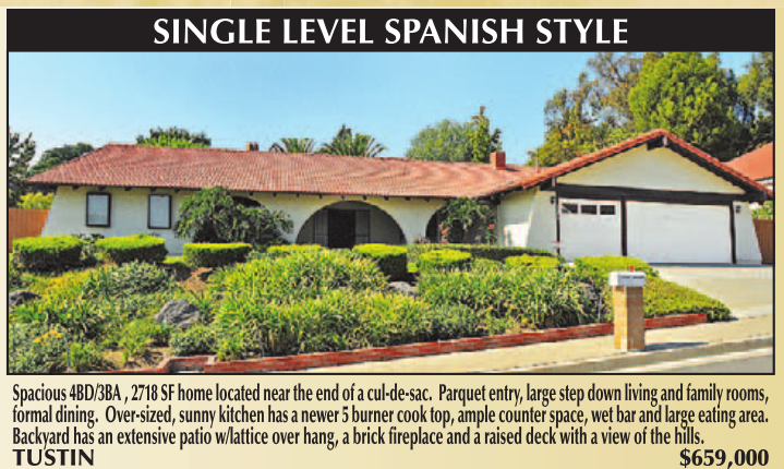 Spacious 4BD/3BA , 2718 SF home located near the end of a cul-de-sac. Parquet entry, large step down living and family rooms, formal dining. Over-sized, sunny kitchen has a newer 5 burner cook top, ample counter space, wet bar and large eating area. Backyard has an extensive patio w/lattice over hang, a brick fireplace and a raised deck with a view of the hills. TUSTIN $659,000