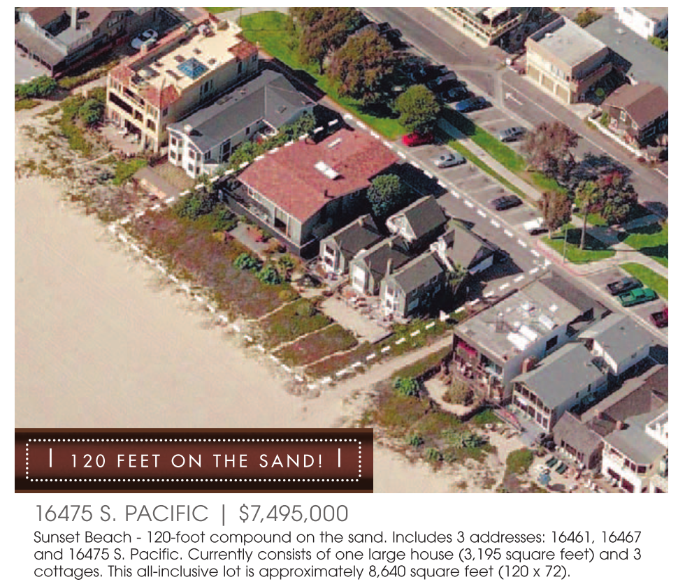| 120 FEET ON THE SAND! | 16475 S. PACIFIC | $7,495,000 Sunset Beach - 120-foot compound on the sand. Includes 3 addresses: 16461, 16467 and 16475 S. Pacific. Currently consists of one large house (3,195 square feet) and 3 cottages. This all-inclusive lot is approximately 8,640 square feet (120 x 72).