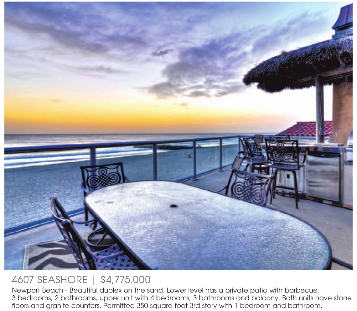 Newport Beach - Beautiful duplex on the sand. Lower level has a private patio with barbecue, 3 bedrooms, 2 bathrooms, upper unit with 4 bedrooms, 3 bathrooms and balcony. Both units have stone floors and granite counters. Permitted 350-square-foot 3rd story with 1 bedroom and bathroom.