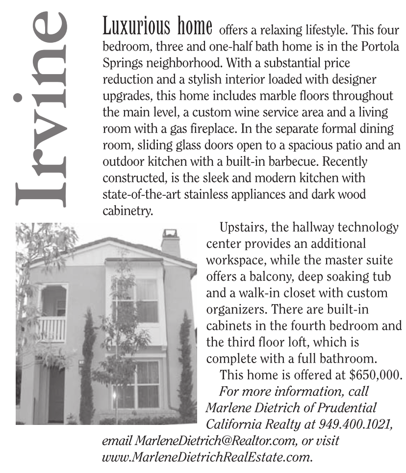 Luxurious home offers a relaxing lifestyle. This four bedroom, three and one-half bath home is in the Portola Springs neighborhood. With a substantial price reduction and a stylish interior loaded with designer upgrades, this home includes marble floors throughout the main level, a custom wine service area and a living room with a gas fireplace. In the separate formal dining room, sliding glass doors open to a spacious patio and an outdoor kitchen with a built-in barbecue. Recently constructed, is the sleek and modern kitchen with state-of-the-art stainless appliances and dark wood cabinetry. Upstairs, the hallway technology center provides an additional workspace, while the master suite offers a balcony, deep soaking tub and a walk-in closet with custom organizers. There are built-in cabinets in the fourth bedroom and the third floor loft, which is complete with a full bathroom. This home is offered at $650,000. For more information, call Marlene Dietrich of Prudential California Realty at 949.400.1021, email MarleneDietrich@Realtor.com, or visit www.MarleneDietrichRealEstate.com.
