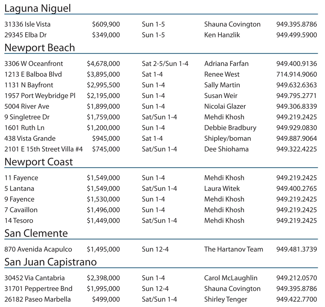31336 Isle Vista $609,900 Sun 1-5 Shauna Covington 949.395.8786 29345 Elba Dr $349,000 Sun 1-5 Ken Hanzlik 949.499.5900 Newport Beach 3306 W Oceanfront $4,678,000 Sat 2-5/Sun 1-4 Adriana Farfan 949.400.9136 1213 E Balboa Blvd $3,895,000 Sat 1-4 Renee West 714.914.9060 1131 N Bayfront $2,995,500 Sun 1-4 Sally Martin 949.632.6363 1957 Port Weybridge Pl $2,195,000 Sun 1-4 Susan Weir 949.795.2771 5004 River Ave $1,899,000 Sun 1-4 Nicolai Glazer 949.306.8339 9 Singletree Dr $1,759,000 Sat/Sun 1-4 Mehdi Khosh 949.219.2425 1601 Ruth Ln $1,200,000 Sun 1-4 Debbie Bradbury 949.929.0830 438 Vista Grande $945,000 Sat 1-4 Shipley/boman 949.887.9064 2101 E 15th Street Villa #4 $745,000 Sat/Sun 1-4 Dee Shiohama 949.322.4225