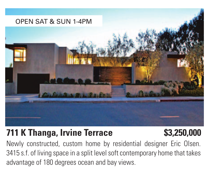 711 K Thanga, Irvine Terrace $3,250,000 Newly constructed, custom home by residential designer Eric Olsen. 3415 s.f. of living space in a split level soft contemporary home that takes advantage of 180 degrees ocean and bay views.