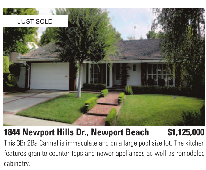 1844 Newport Hills Dr., Newport Beach $1,125,000 This 3Br 2Ba Carmel is immaculate and on a large pool size lot. The kitchen features granite counter tops and newer appliances as well as remodeled cabinetry.