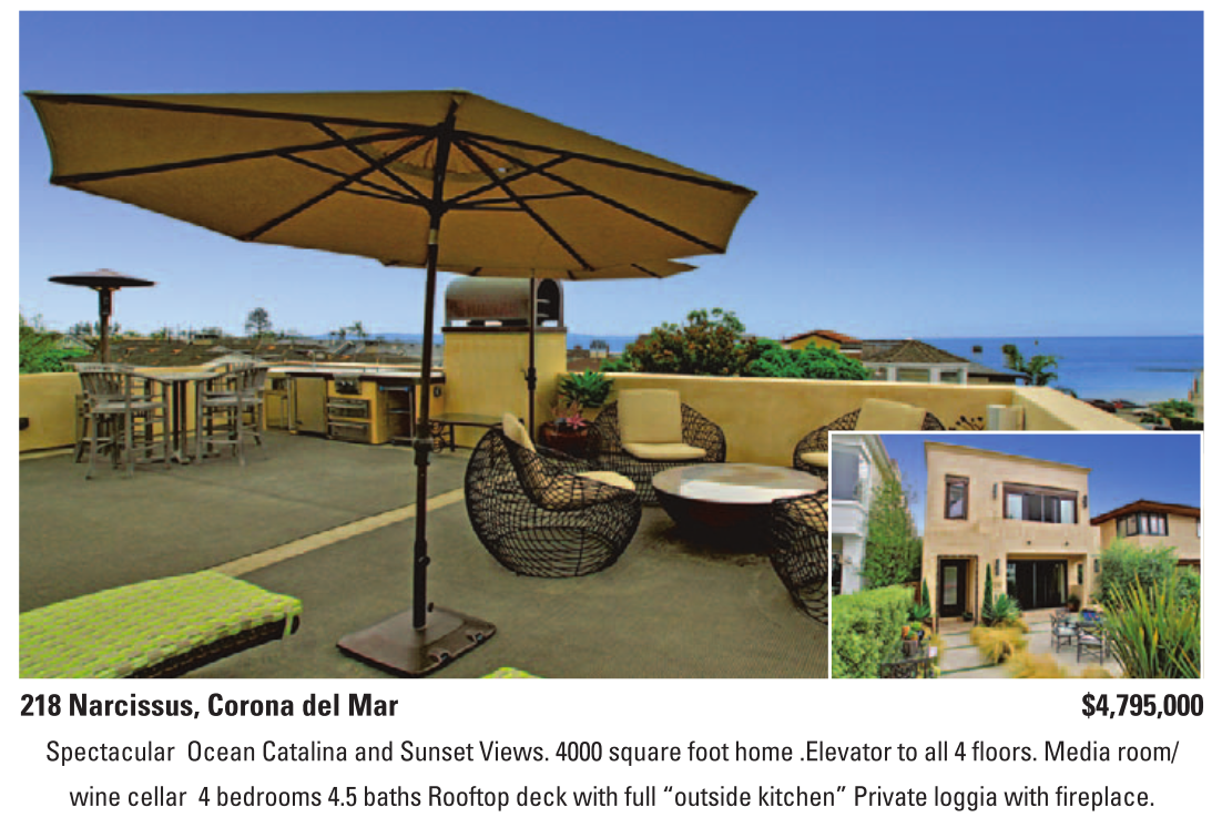 218 Narcissus, Corona del Mar $4,795,000 Spectacular Ocean Catalina and Sunset Views. 4000 square foot home .Elevator to all 4 floors. Media room/ wine cellar 4 bedrooms 4.5 baths Rooftop deck with full “outside kitchen” Private loggia with fireplace.
