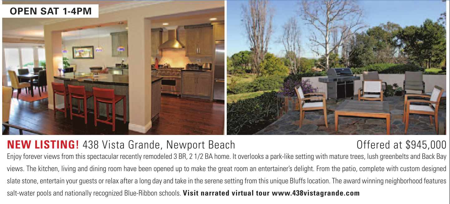 OPEN SAT 1-4PM NEW LISTING! 438 Vista Grande, Newport Beach Offered at $945,000 Enjoy forever views from this spectacular recently remodeled 3 BR, 2 1/2 BA home. It overlooks a park-like setting with mature trees, lush greenbelts and Back Bay views. The kitchen, living and dining room have been opened up to make the great room an entertainer’s delight. From the patio, complete with custom designed slate stone, entertain your guests or relax after a long day and take in the serene setting from this unique Bluffs location. The award winning neighborhood features salt-water pools and nationally recognized Blue-Ribbon schools. Visit narrated virtual tour www.438vistagrande.com See also