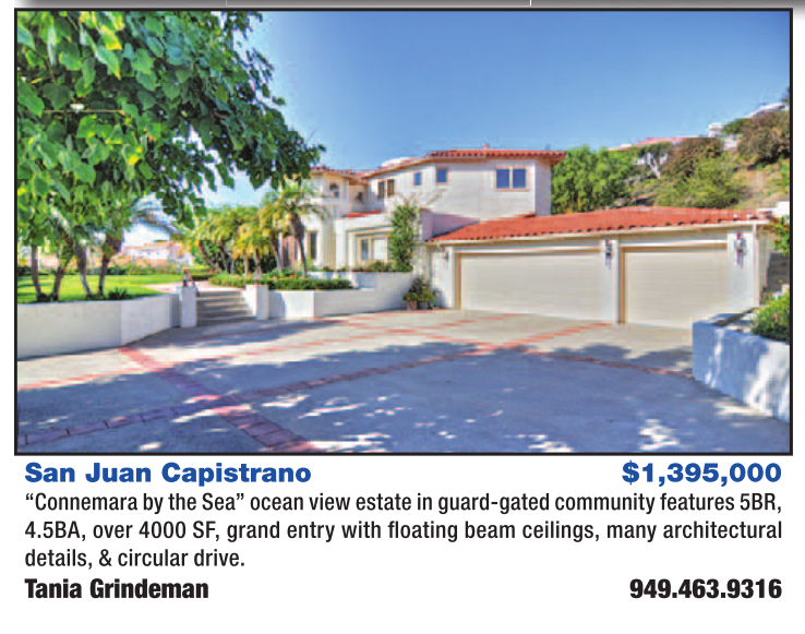 San Juan Capistrano $1,395,000 “Connemara by the Sea” ocean view estate in guard-gated community features 5BR, 4.5BA, over 4000 SF, grand entry with fl oating beam ceilings, many architectural details, & circular drive. Tania Grindeman 949.463.9316