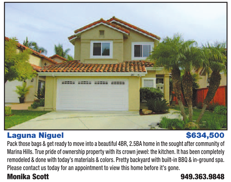 Laguna Niguel $634,500 Pack those bags & get ready to move into a beautiful 4BR, 2.5BA home in the sought after community of Marina Hills. True pride of ownership property with its crown jewel: the kitchen. It has been completely remodeled & done with today’s materials & colors. Pretty backyard with built-in BBQ & in-ground spa. Please contact us today for an appointment to view this home before it’s gone. Monika Scott 949.363.9848