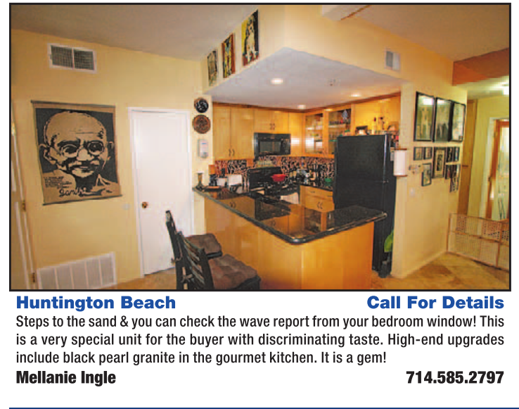 Huntington Beach Call For Details Steps to the sand & you can check the wave report from your bedroom window! This is a very special unit for the buyer with discriminating taste. High-end upgrades include black pearl granite in the gourmet kitchen. It is a gem! Mellanie Ingle 714.585.2797