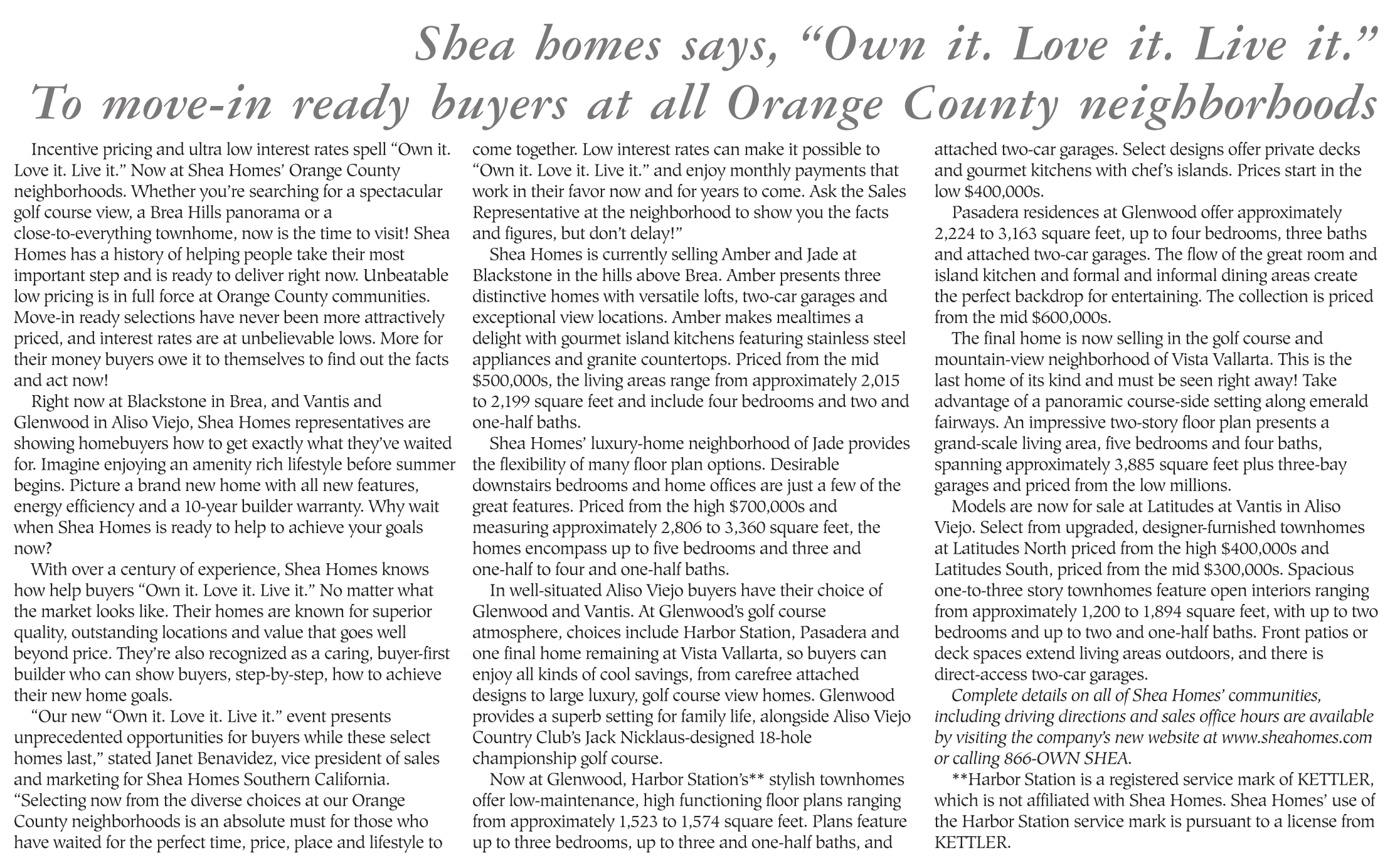 Love it. Live it.” Now at Shea Homes’ Orange County neighborhoods. Whether you’re searching for a spectacular golf course view, a Brea Hills panorama or a close-to-everything townhome, now is the time to visit! Shea Homes has a history of helping people take their most important step and is ready to deliver right now. Unbeatable low pricing is in full force at Orange County communities. Move-in ready selections have never been more attractively priced, and interest rates are at unbelievable lows. More for their money buyers owe it to themselves to find out the facts and act now!