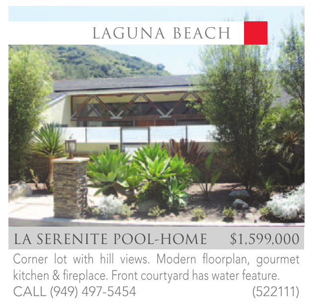 LA SERENITE POOL-HOME $1,599,000 Corner lot with hill views. Modern floorplan, gourmet kitchen & fireplace. Front courtyard has water feature. CALL (949) 497-5454 (522111)