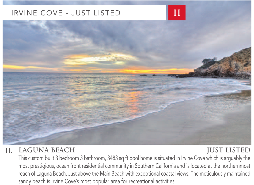 LAGUNA BEACH JUST LISTED This custom built 3 bedroom 3 bathroom, 3483 sq ft pool home is situated in Irvine Cove which is arguably the most prestigious, ocean front residential community in Southern California and is located at the northernmost reach of Laguna Beach. Just above the Main Beach with exceptional coastal views. The meticulously maintained sandy beach is Irvine Cove’s most popular area for recreational activities.
