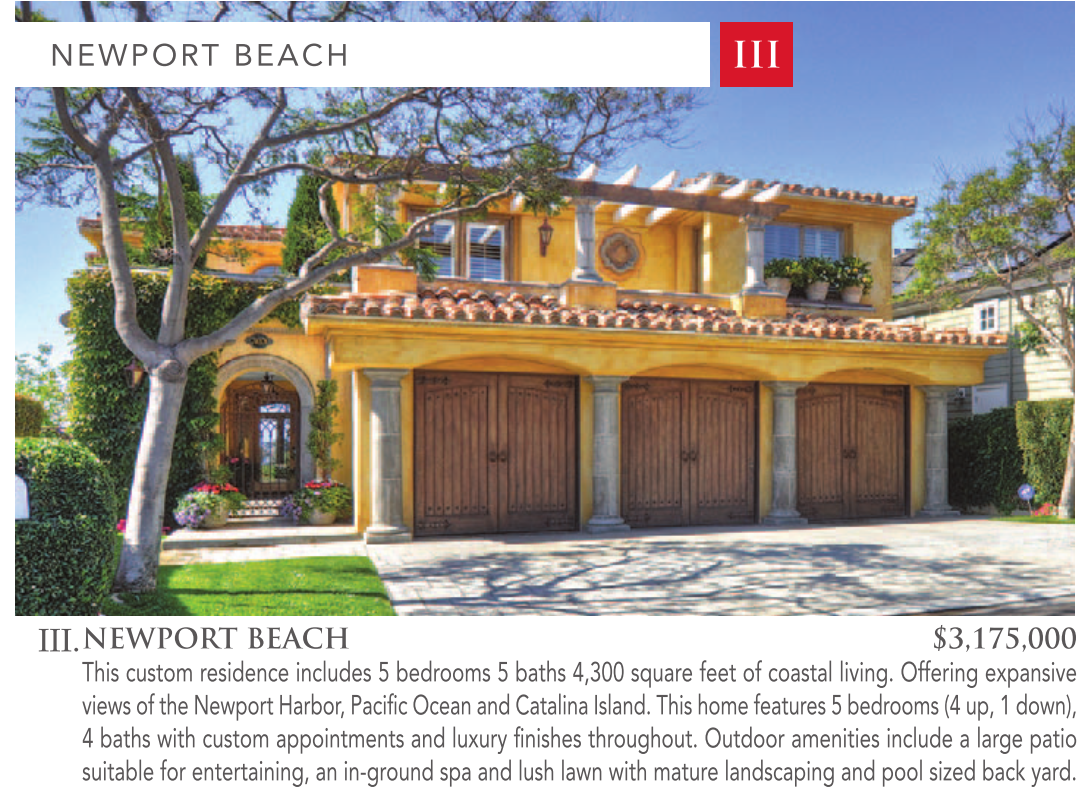 III. NEWPORT BEACH $3,175,000 This custom residence includes 5 bedrooms 5 baths 4,300 square feet of coastal living. Offering expansive views of the Newport Harbor, Pacific Ocean and Catalina Island. This home features 5 bedrooms (4 up, 1 down), 4 baths with custom appointments and luxury finishes throughout. Outdoor amenities include a large patio suitable for entertaining, an in-ground spa and lush lawn with mature landscaping and pool sized back yard.