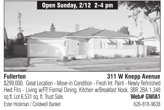 $299,000. Great Location - Move-in Condition - Fresh Int. Paint - Newly Refinished Hwd Flrs - Living w/FP, Formal Dining, Kitchen w/Breakfast Nook, 3BR 2BA 1,348 sq.ft. Lot 6,531 sq. ft. Trust Sale. Web# GWIA1 Ester Hickman / Coldwell Banker 626-818-9638
