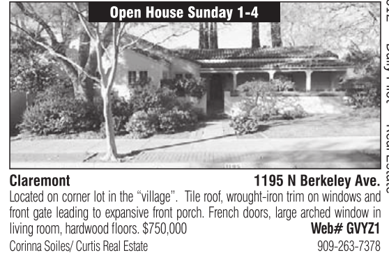 Claremont 1195 N Berkeley Ave. Located on corner lot in the “village”. Tile roof, wrought-iron trim on windows and front gate leading to expansive front porch. French doors, large arched window in living room, hardwood floors. $750,000 Web# GVYZ1 Open House Sunday 1-4 Corinna Soiles/ Curtis Real Estate 909-263-7378