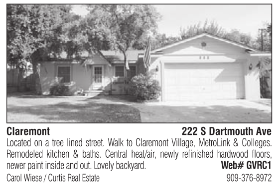 Claremont 222 S Dartmouth Ave Located on a tree lined street. Walk to Claremont Village, MetroLink & Colleges. Remodeled kitchen & baths. Central heat/air, newly refinished hardwood floors, newer paint inside and out. Lovely backyard. Web# GVRC1 Carol Wiese / Curtis Real Estate 909-376-8972