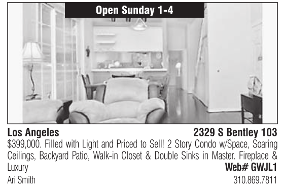 Los Angeles 2329 S Bentley 103 $399,000. Filled with Light and Priced to Sell! 2 Story Condo w/Space, Soaring Ceilings, Backyard Patio, Walk-in Closet & Double Sinks in Master. Fireplace & Luxury Web# GWJL1