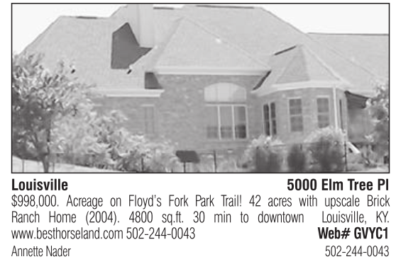 Louisville 5000 Elm Tree Pl $998,000. Acreage on Floyd’s Fork Park Trail! 42 acres with upscale Brick Ranch Home (2004). 4800 sq.ft. 30 min to downtown Louisville, KY. www.besthorseland.com 502-244-0043 Web# GVYC1 Annette Nader 502-244-0043